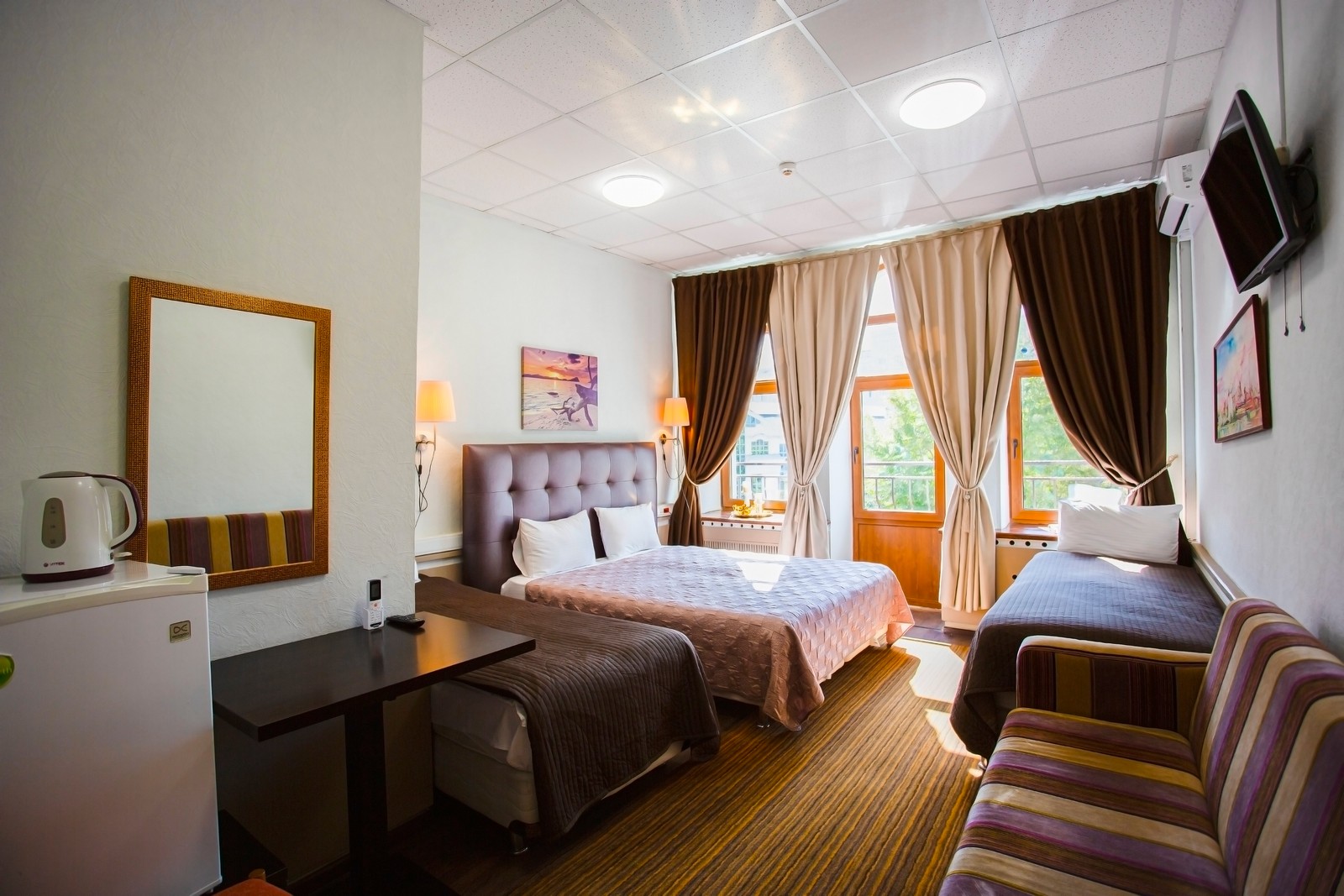 Описание: четыре односпальные кровати, ванная комната, шкаф, рабочий стол, отличная звукоизоляция, окна выходят на Чистопрудный бульвар.